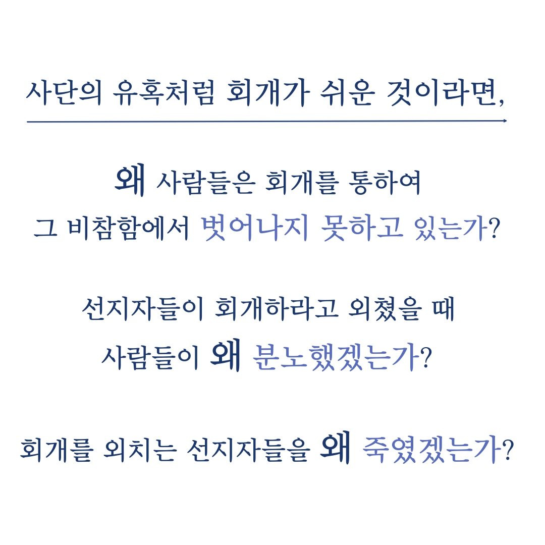옛적 길 무엇이 비참인가 by 깨우는자동훈 2023. 5. 27. 공유하기 게시글 관리 바른신앙 관련글 통회하는 심령을 향한 4가지 언약의 말씀 배우자를 구할 때 기도할 3가지 참된 믿음을 가질 수 있는 사람의 5가지 조건 은혜가 주는 힘 댓글