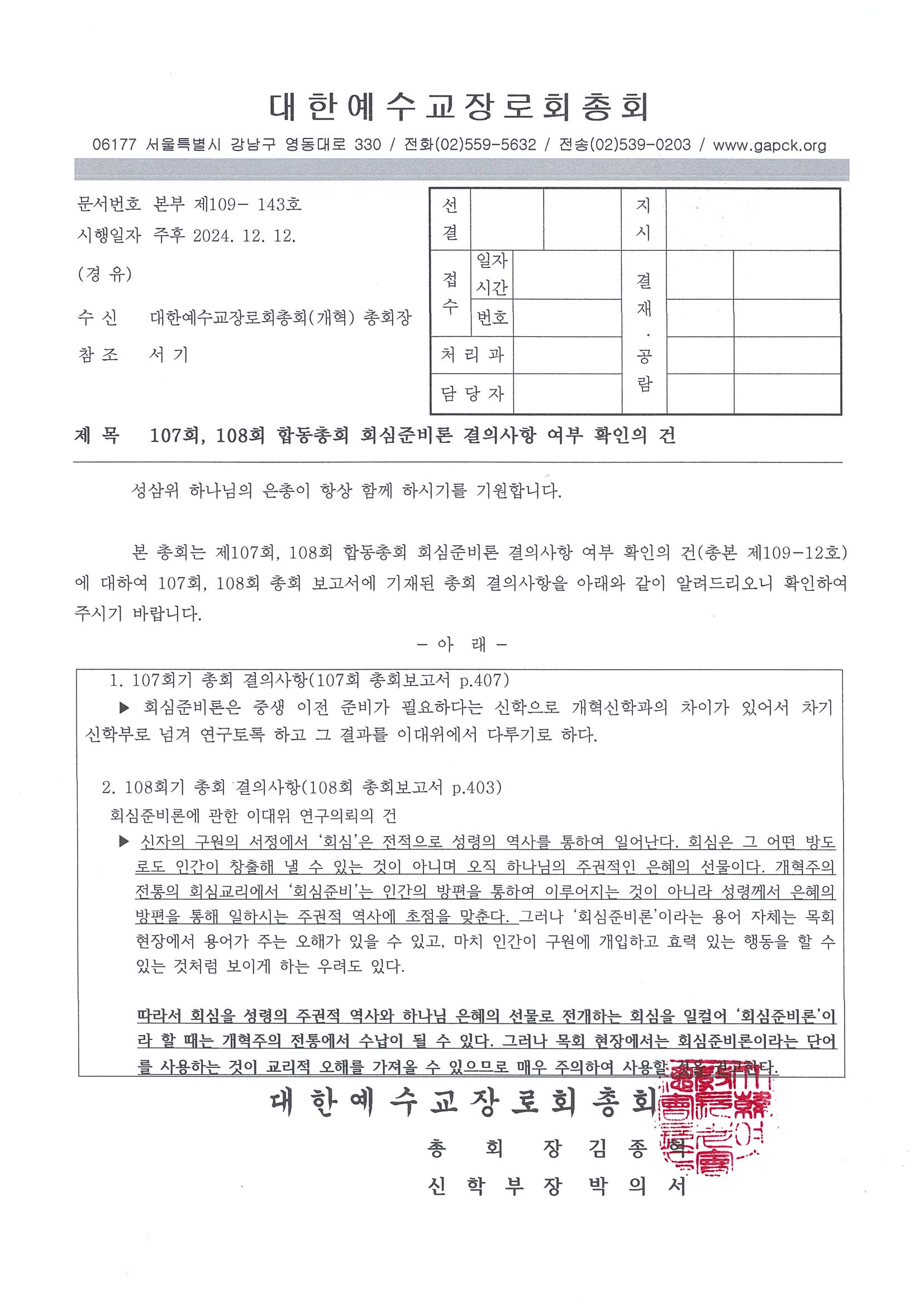 회심준비교리에 대한 107회, 108회 합동총회 결의사항